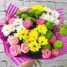 Букет «Улыбка» из солнечных роз и хирзантем- это настроение на весь день. Он заряжает позитивной энергией и положительными эмоциями.